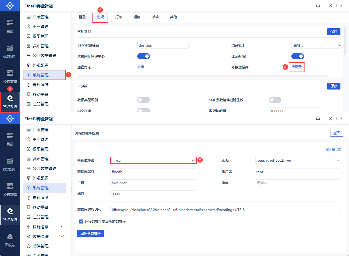 FineReport/FineBI 支持使用内置 FineDB 数据库或启用外接 FineDB 数据库。
