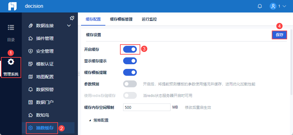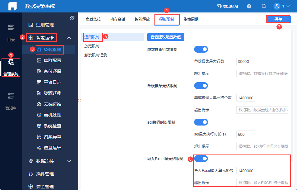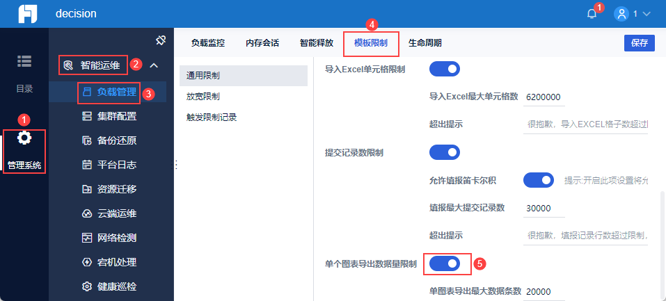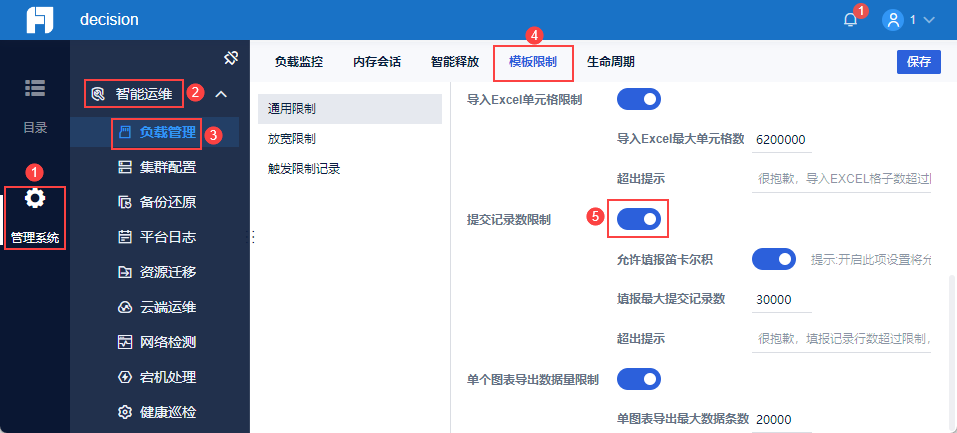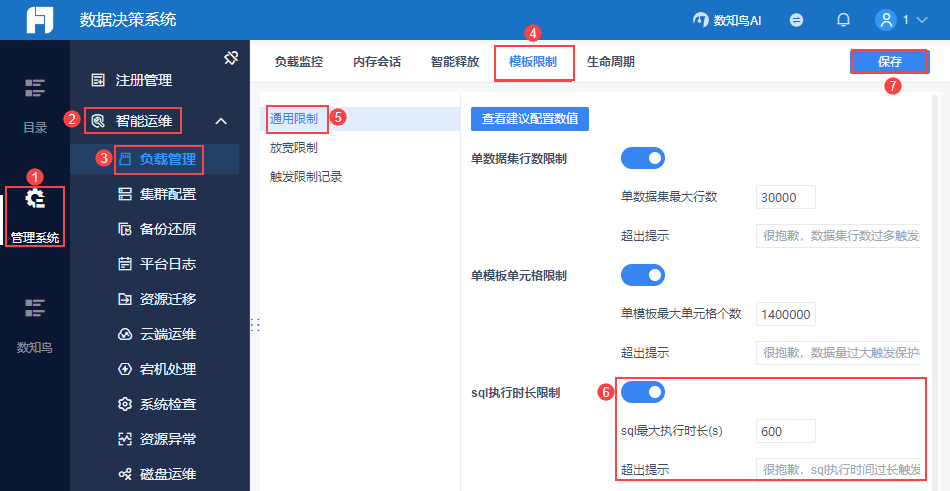管理员登录数据决策系统,点击「管理系统>智能运维>负载管理」,其中「负载监控」内可进行智能预警配置。