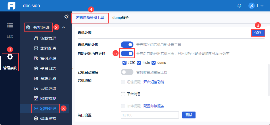 管理员登录数据决策系统,点击「管理系统>智能运维>宕机处理」,其中「宕机处理」内可进行宕机通知配置。