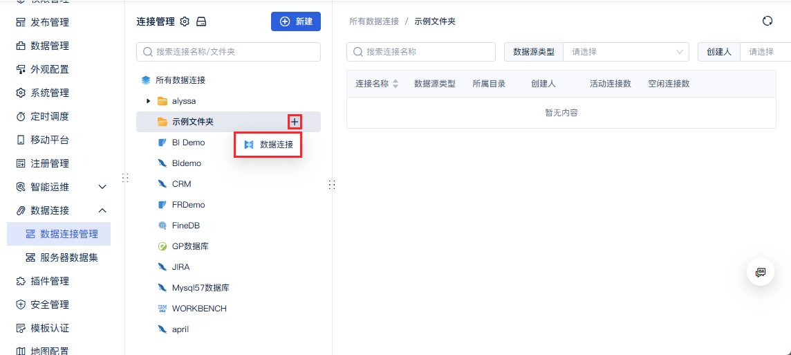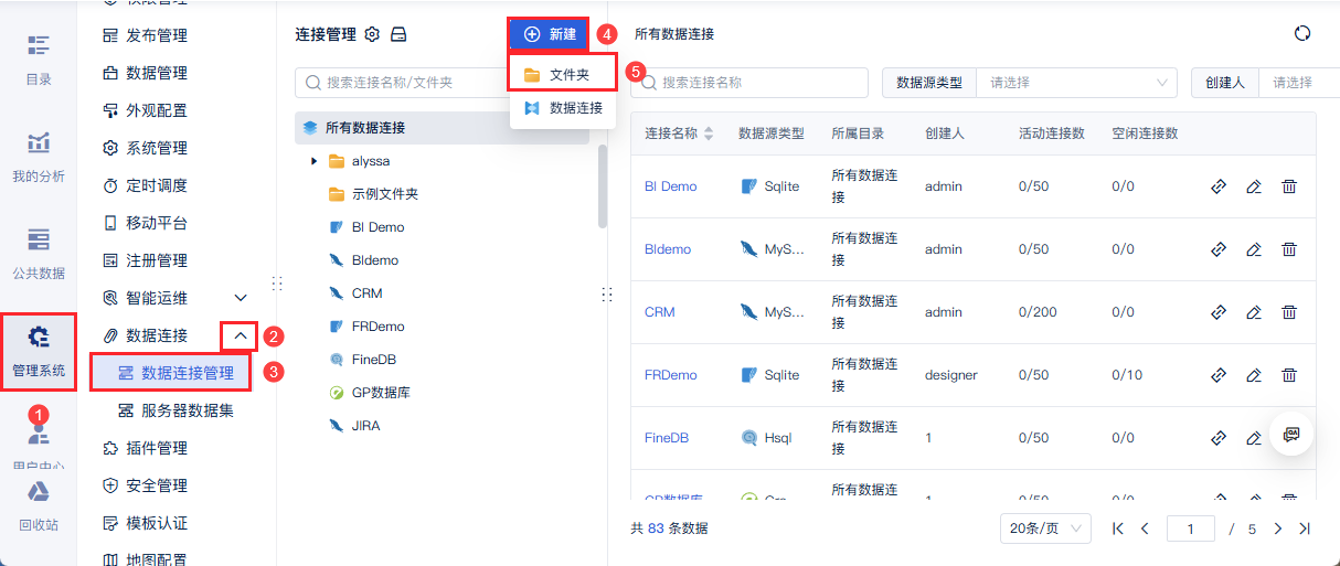 1)管理员进入 FineBI 工程,点击「管理系统>数据连接管理」页面。点击「新建>文件夹」,可以使用文件夹对数据连接进行分类管理。如下图所示: