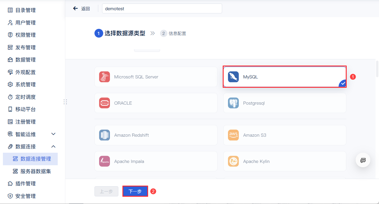 3)选择数据库类型,例如要连接 MySQL 类型的数据库,即需要选择「MySQL」,然后点击「下一步」按钮。如下图所示: