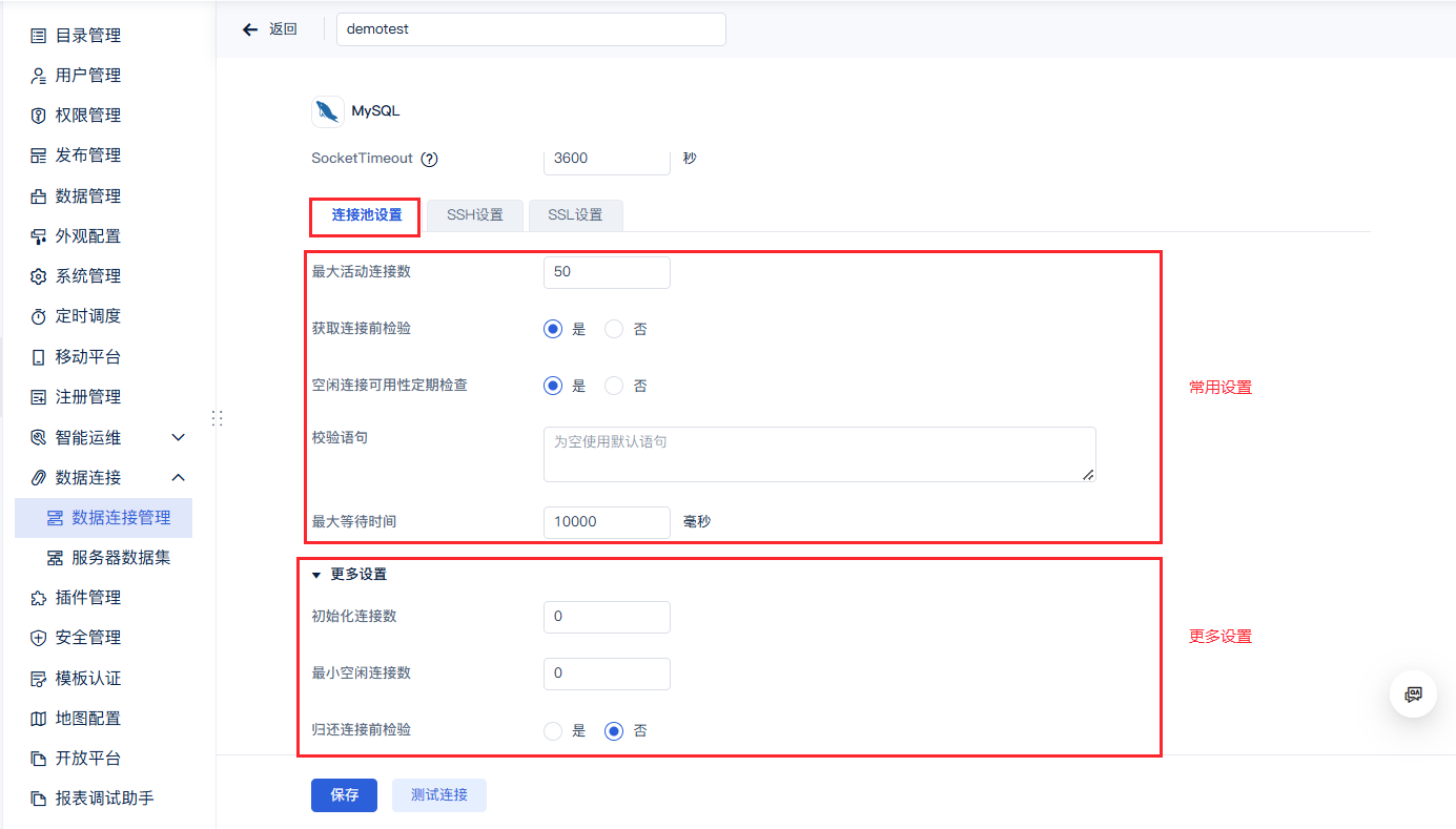 若用户不需要设置连接池,即可点击「保存」。完成数据连接配置。