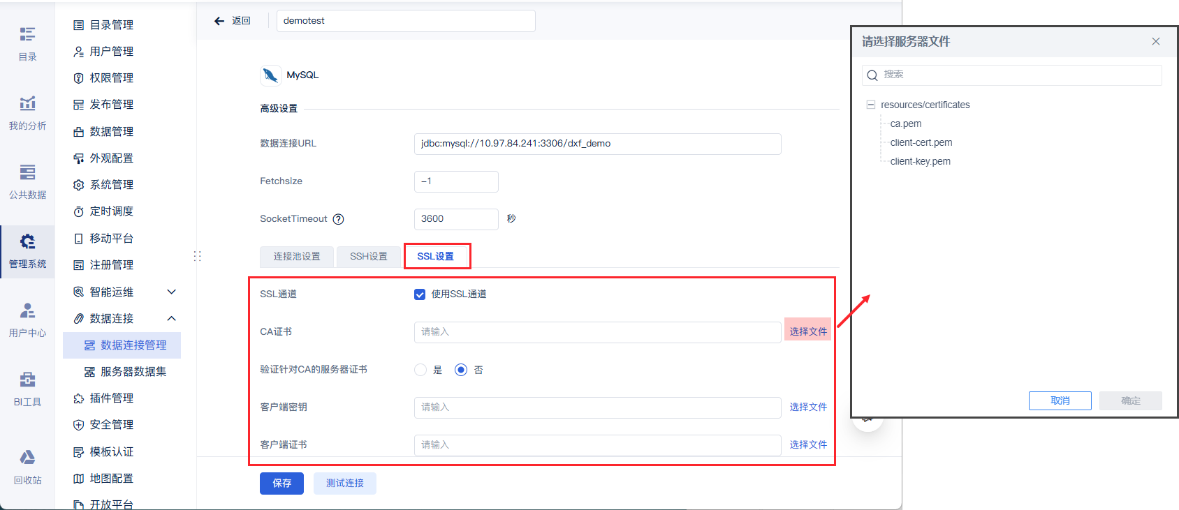 2)勾选「使用SSL通道」,将文件添加进对应位置。如下图所示: