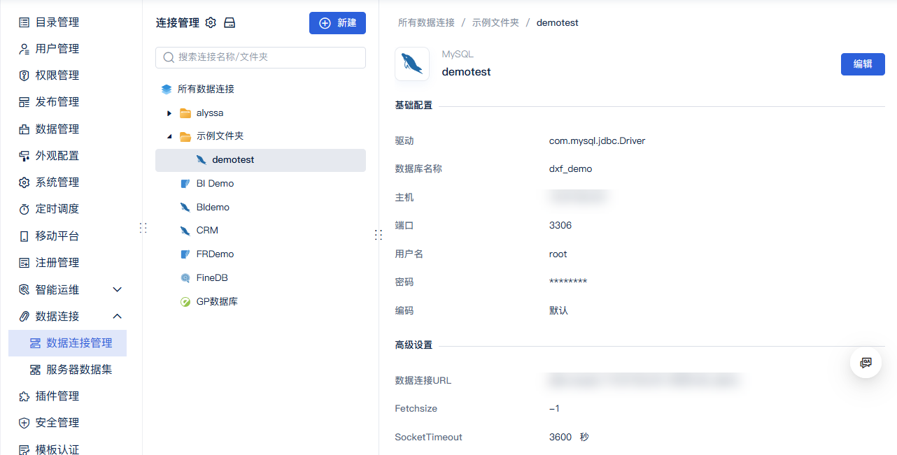 用户可在列表对数据连接做编辑、重命名、复制、删除、测试连接操作。如下图所示: