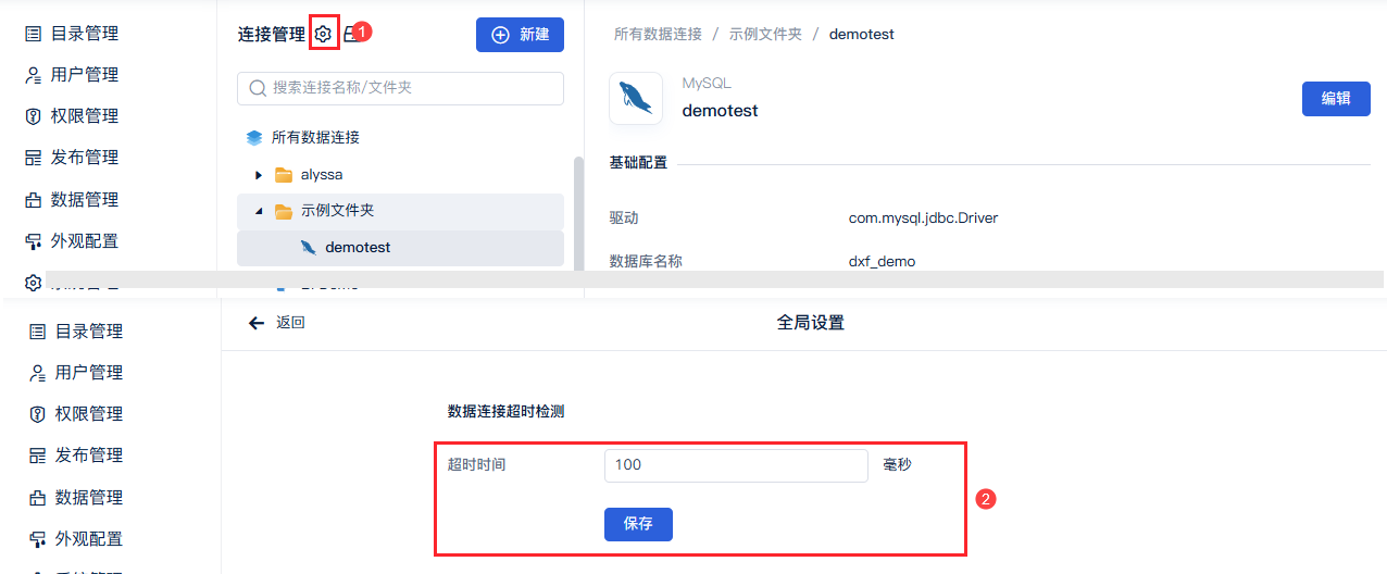 在「数据连接管理>全局设置」中,提供「数据连接超时检测」功能,支持用户自定义数据连接的超时时间。