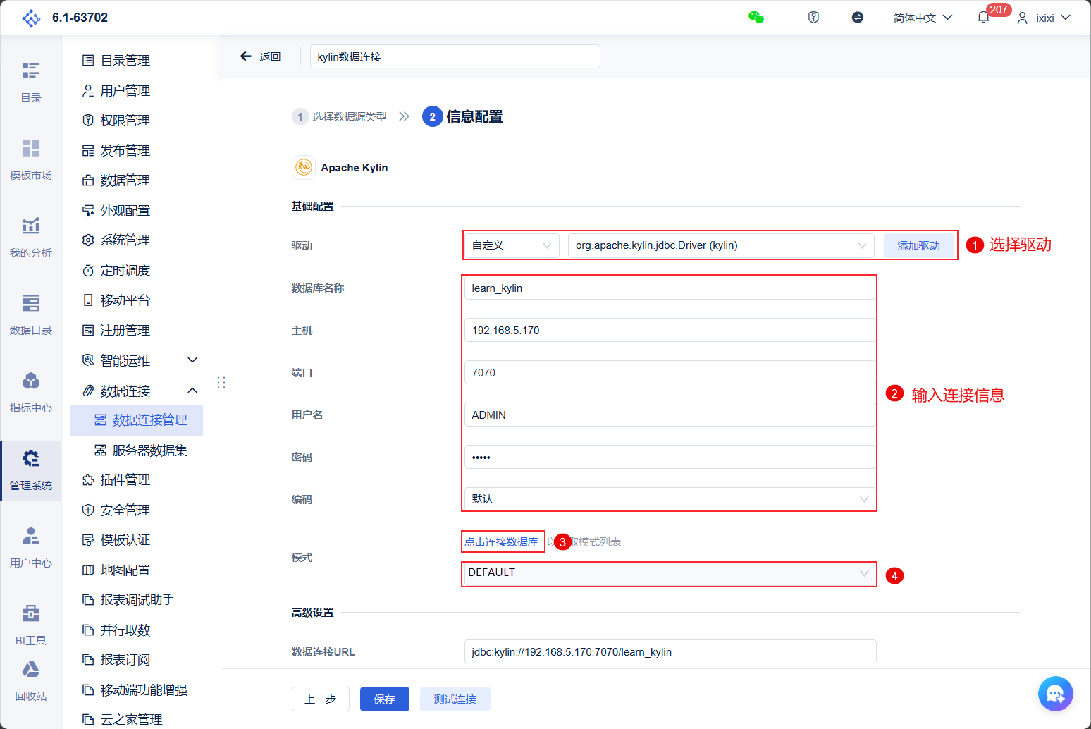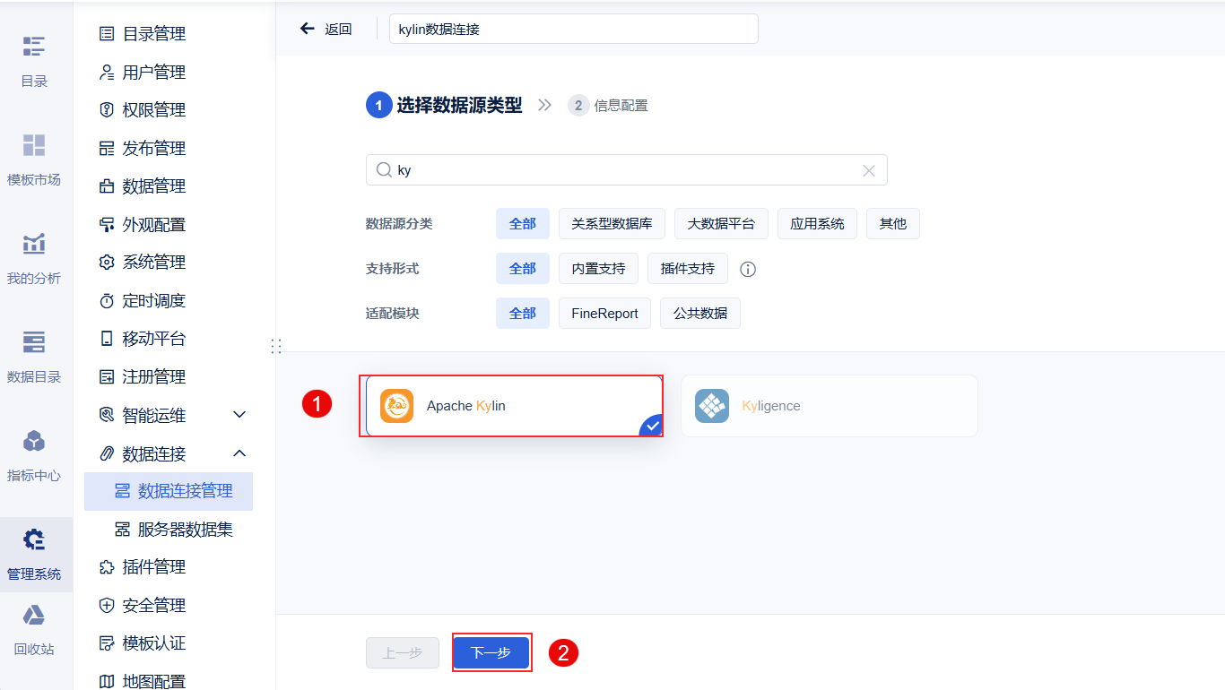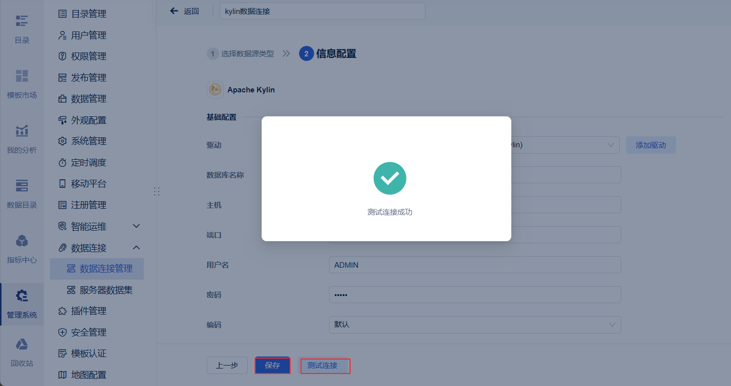注:如果非管理员用户想要配置数据连接,需要管理员给其分配管理系统下数据连接节点的权限,具体操作请查看 数据连接权限