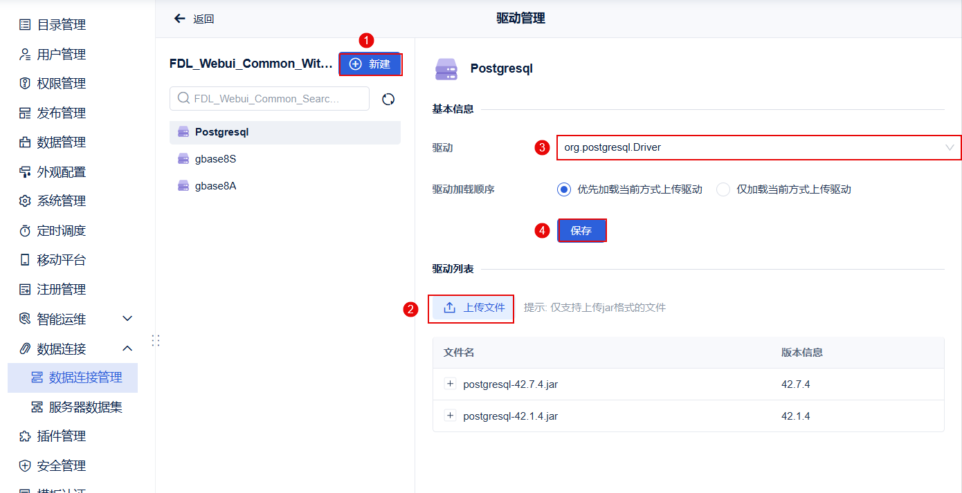 1)下载驱动,并将其上传至 FineBI,如何上传可参见:驱动管理 2.1 节。驱动上传界面如下图所示,上传成功后点击保存。