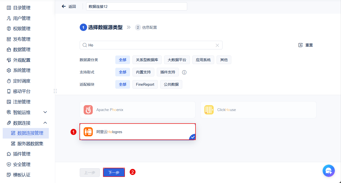 1)管理员BI,选择「管理系统>数据连接>数据连接管理>新建」,点击「数据连接」,在「全部」选项下选择「Hologres」,如下图所示: