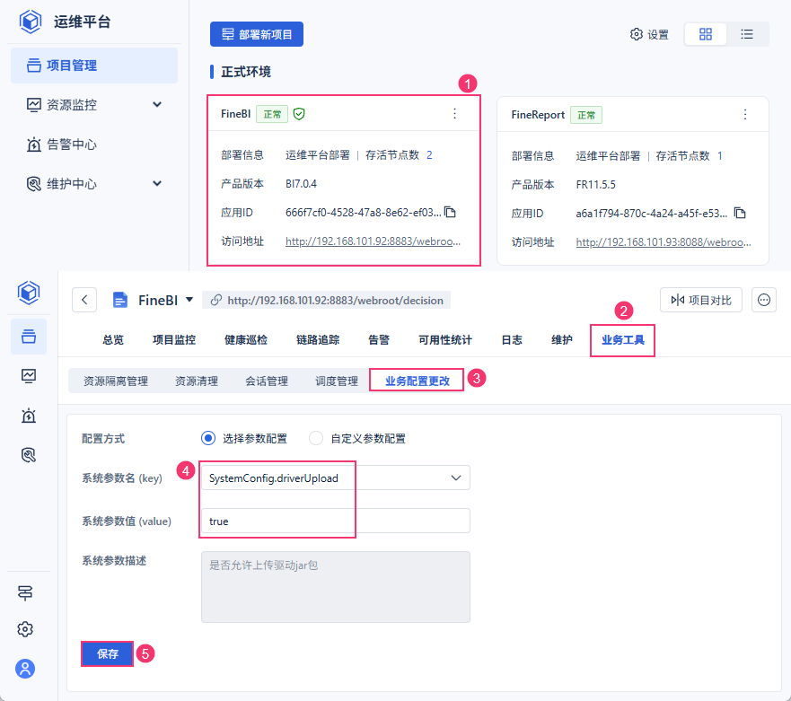 2)点击「业务工具>业务配置更改」,设置参数「SystemConfig.driverUpload」的值为「true」,点击「保存」