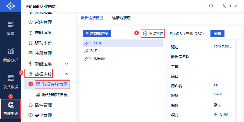 1)管理员登录 FineBI 系统,点击「管理系统>数据连接管理>驱动管理」,如下图所示: