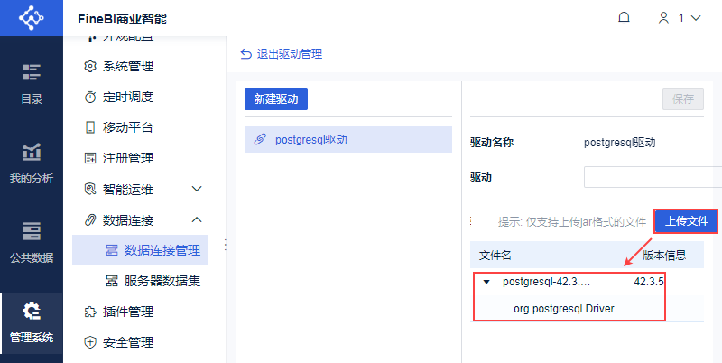 重启后再次登录 FineBI 系统,即可通过「驱动管理」上传驱动。