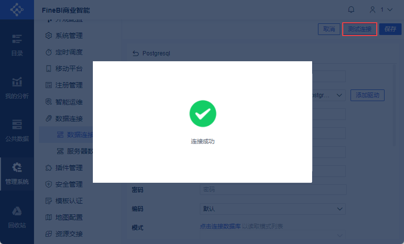 1)在「数据连接管理」界面点击「新建数据连接」,新建一个 PostgreSQL 数据连接,如下图所示: