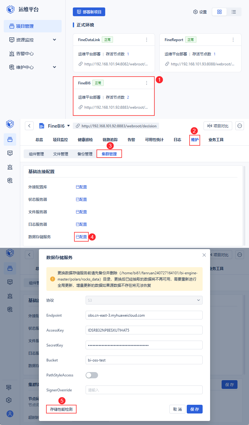 详情请参见:FineBI对接华为云OBS实现数据存储服务 、FineBI对接阿里云OSS实现数据存储服务
