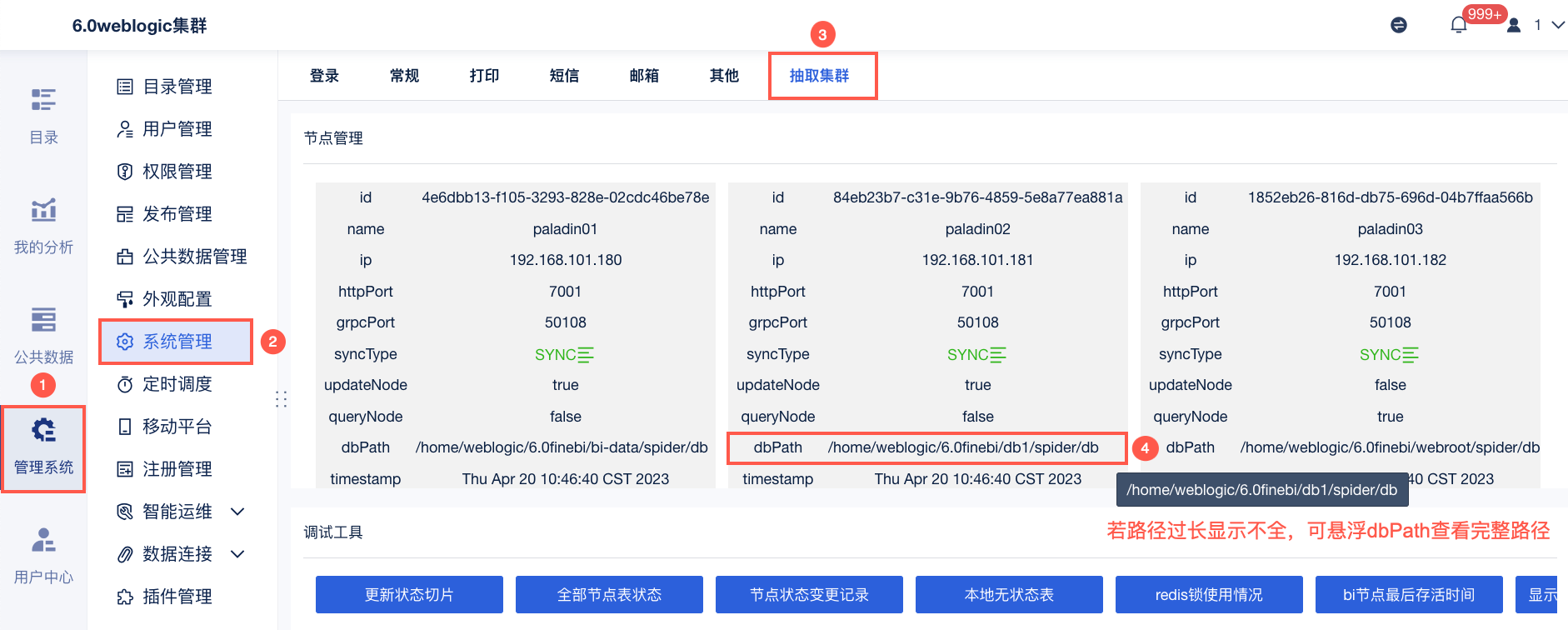 管理员登录数据决策系统,点击「管理系统>系统管理>抽取集群」,在节点管理页面内查看各节点抽取数据的存放路径,如下图所示: