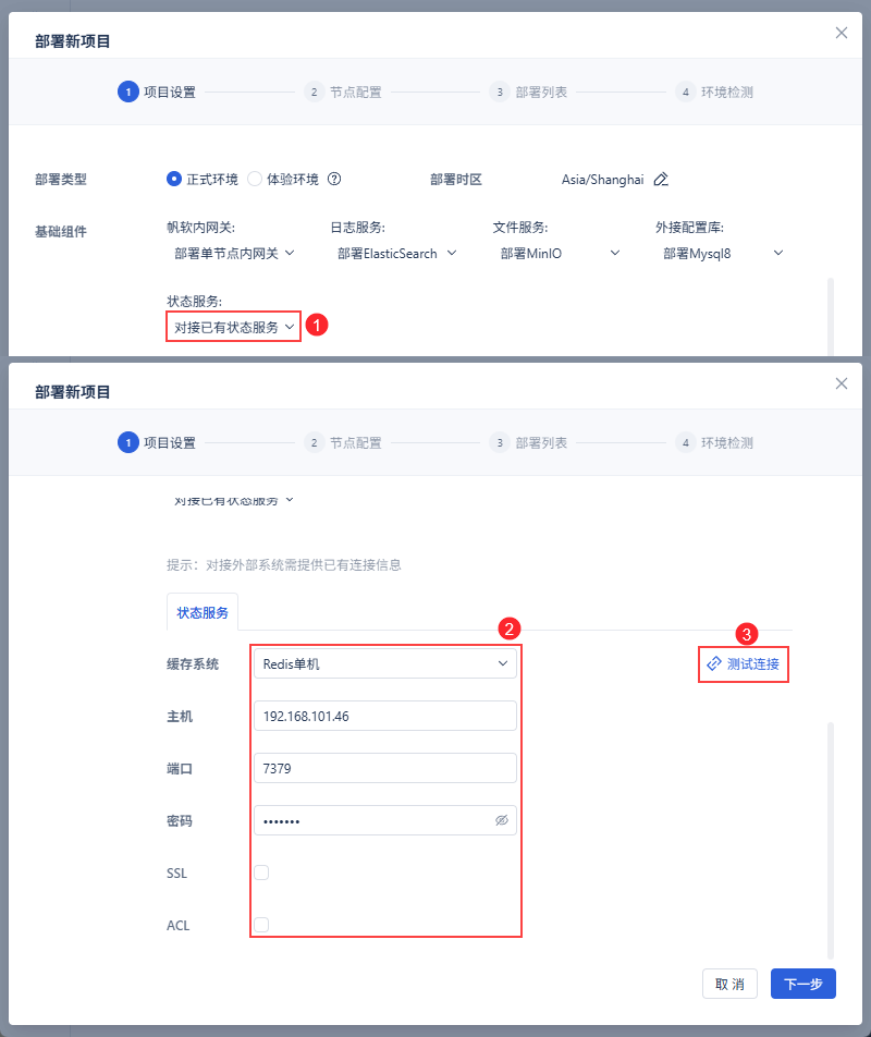 在「部署新项目-项目设置」时,可接入自备的单机Redis作为状态服务器。
