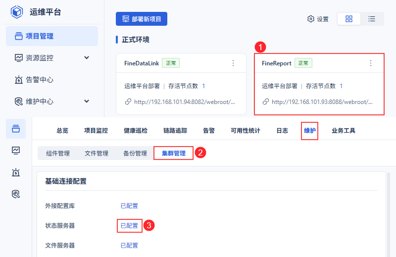 2)点击「维护>集群管理」,对「状态服务器」进行配置