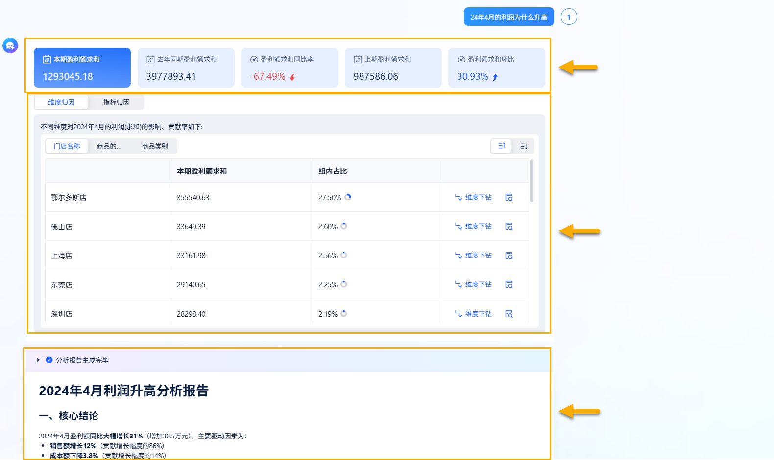 也可以直接提问“24年4月的利润为什么升高”此类问原因的 query ,直接触发归因分析。如下图所示: