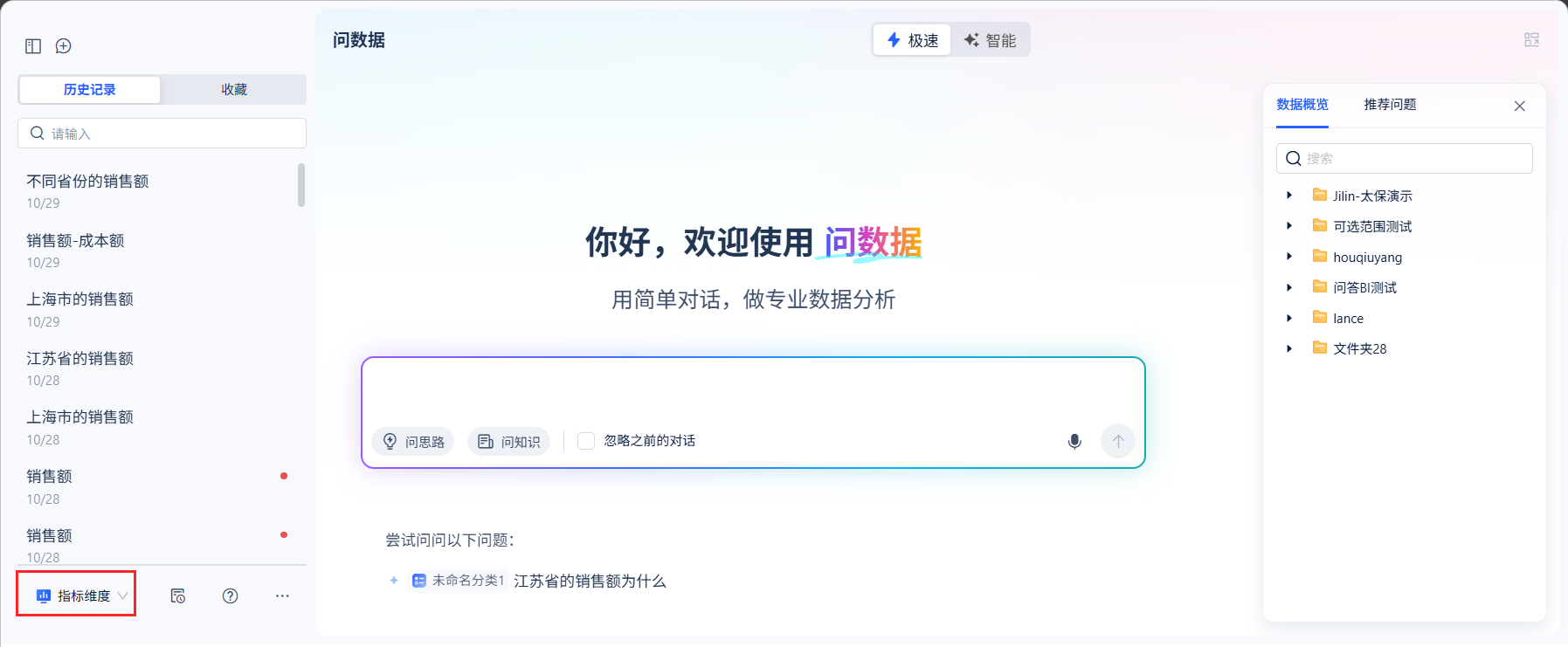 切换到指标维度后,直接使用管理员准备的指标维度进行提问,如下图所示: