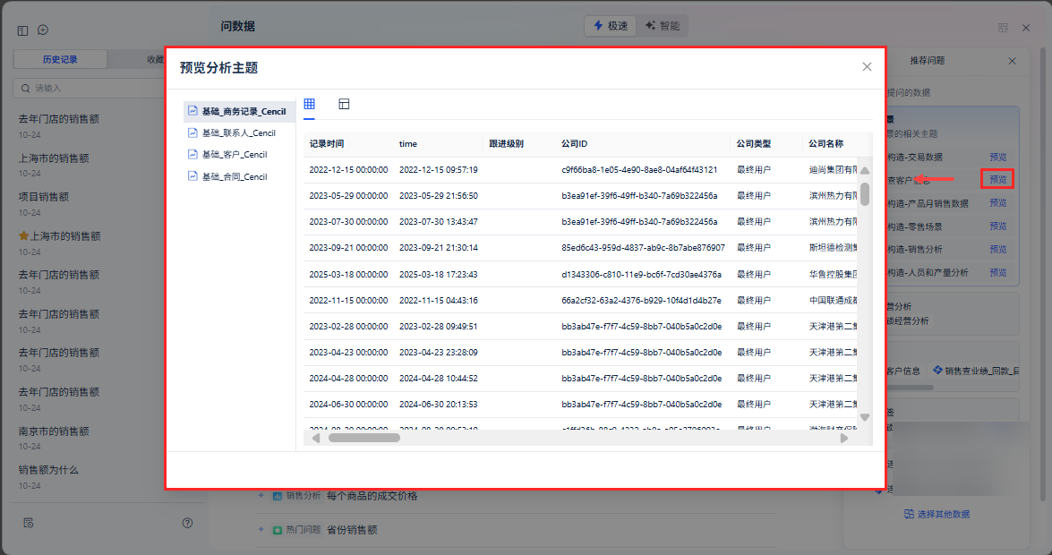 点击「数据全览」展开后,可点击「预览」查看主题内的详细数据,辅助判断是否为所需选择的数据。