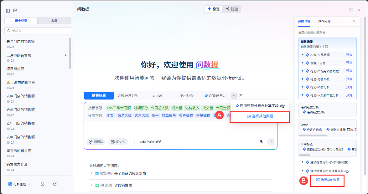 进入FineBI,点击「问数据」按钮,如下图所示: