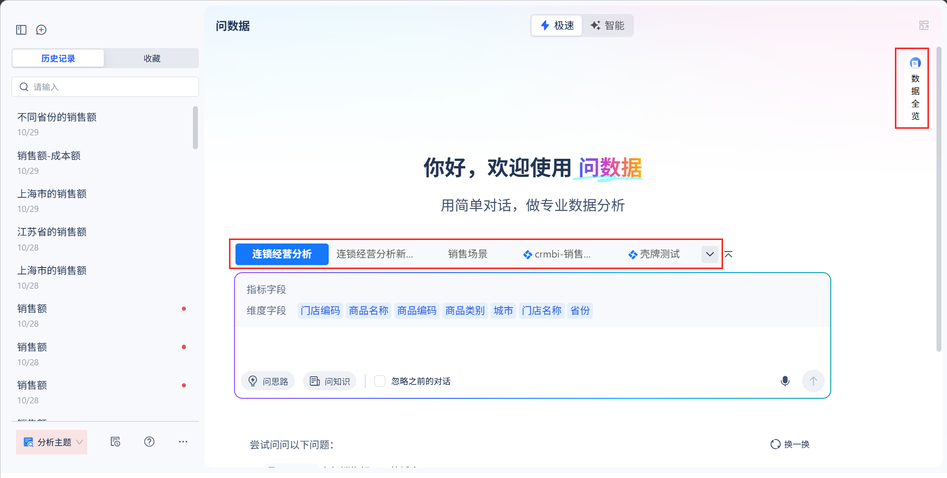 用户可直接点选提问框上方的数据列表进行提问,也可点击「数据全览」展开数据列表后选择。如下图所示:
