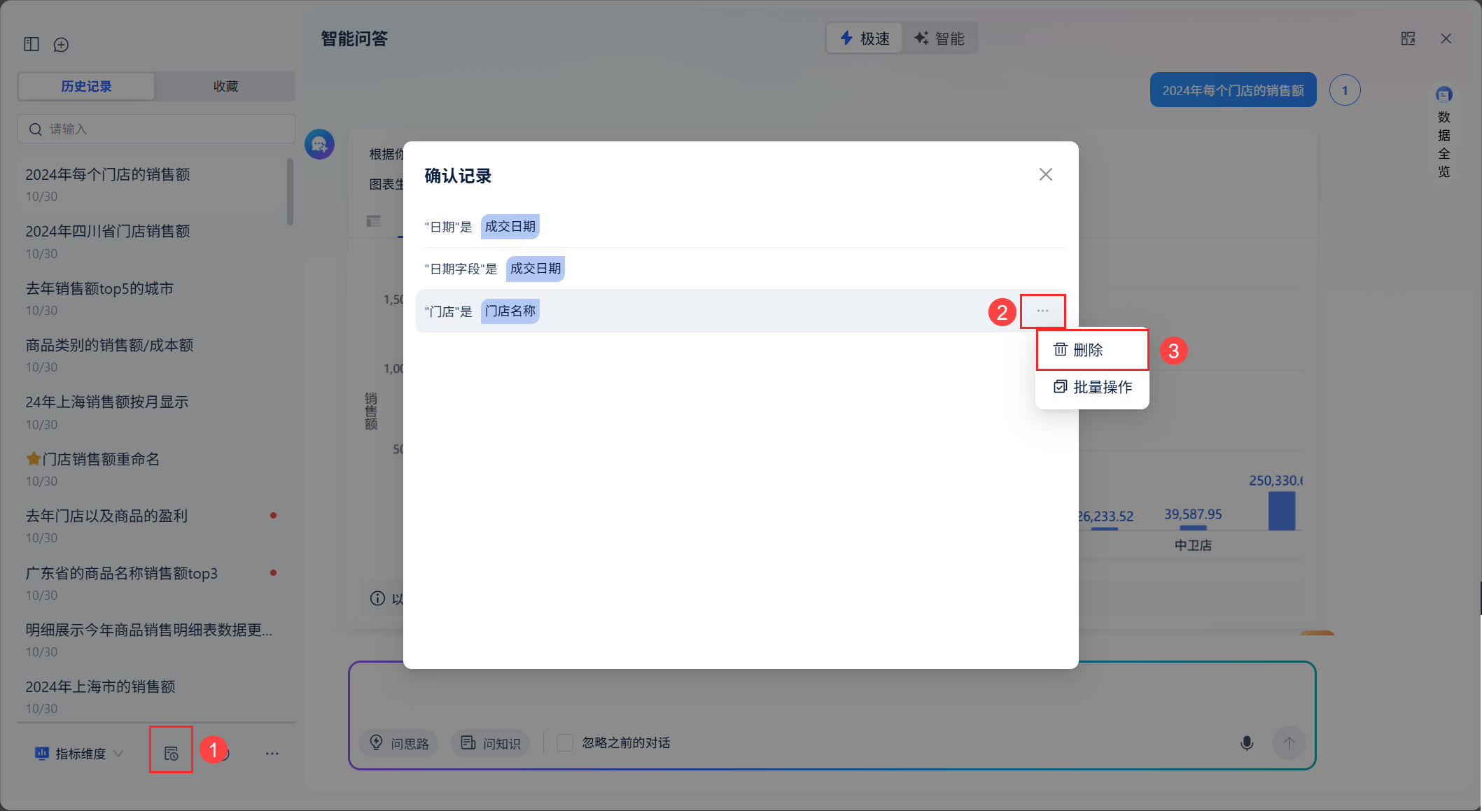 1)确认主题:当提问内容(如 “去年上海市的销售额”)触发系统匹配到「销售场景」标签下的多个分析主题时,系统会展示这些主题供用户选择。选中目标分析主题后: