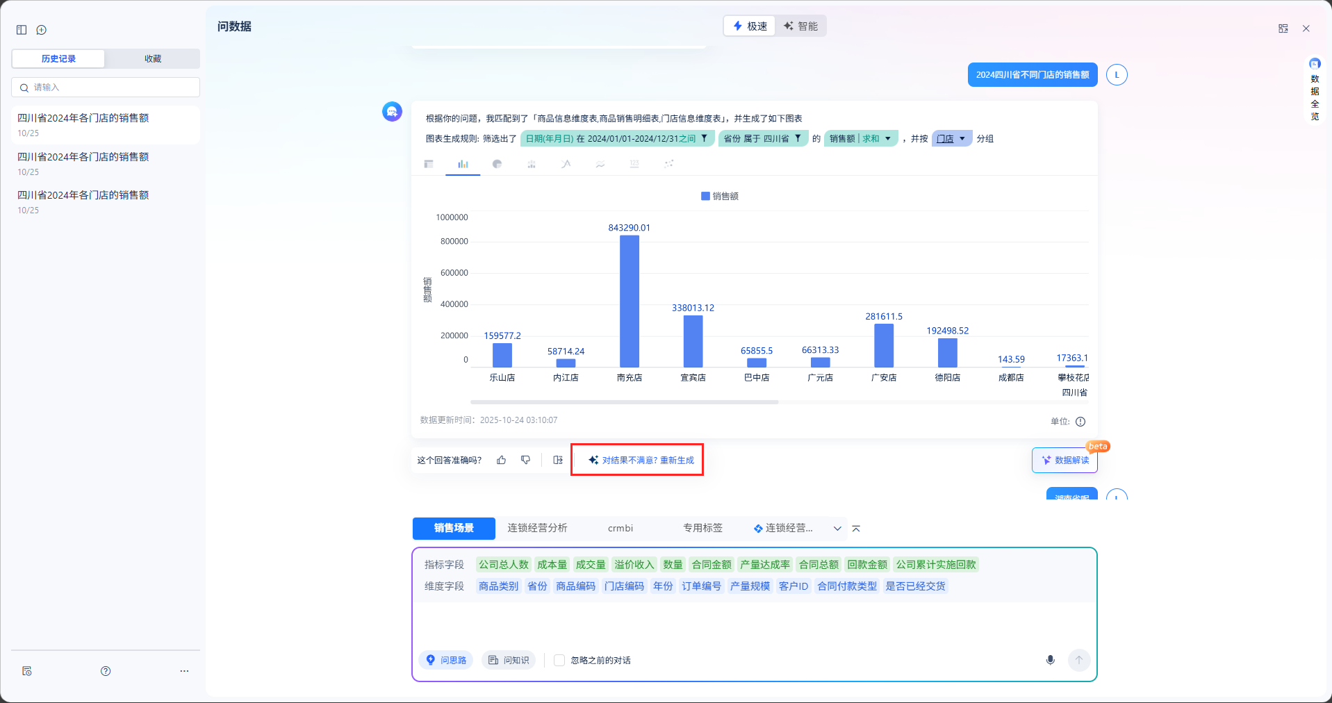 当用户自然语言的提问无法获得 FineChatBI 准确的回复时,可以点击「对结果不满意?重新生成」。