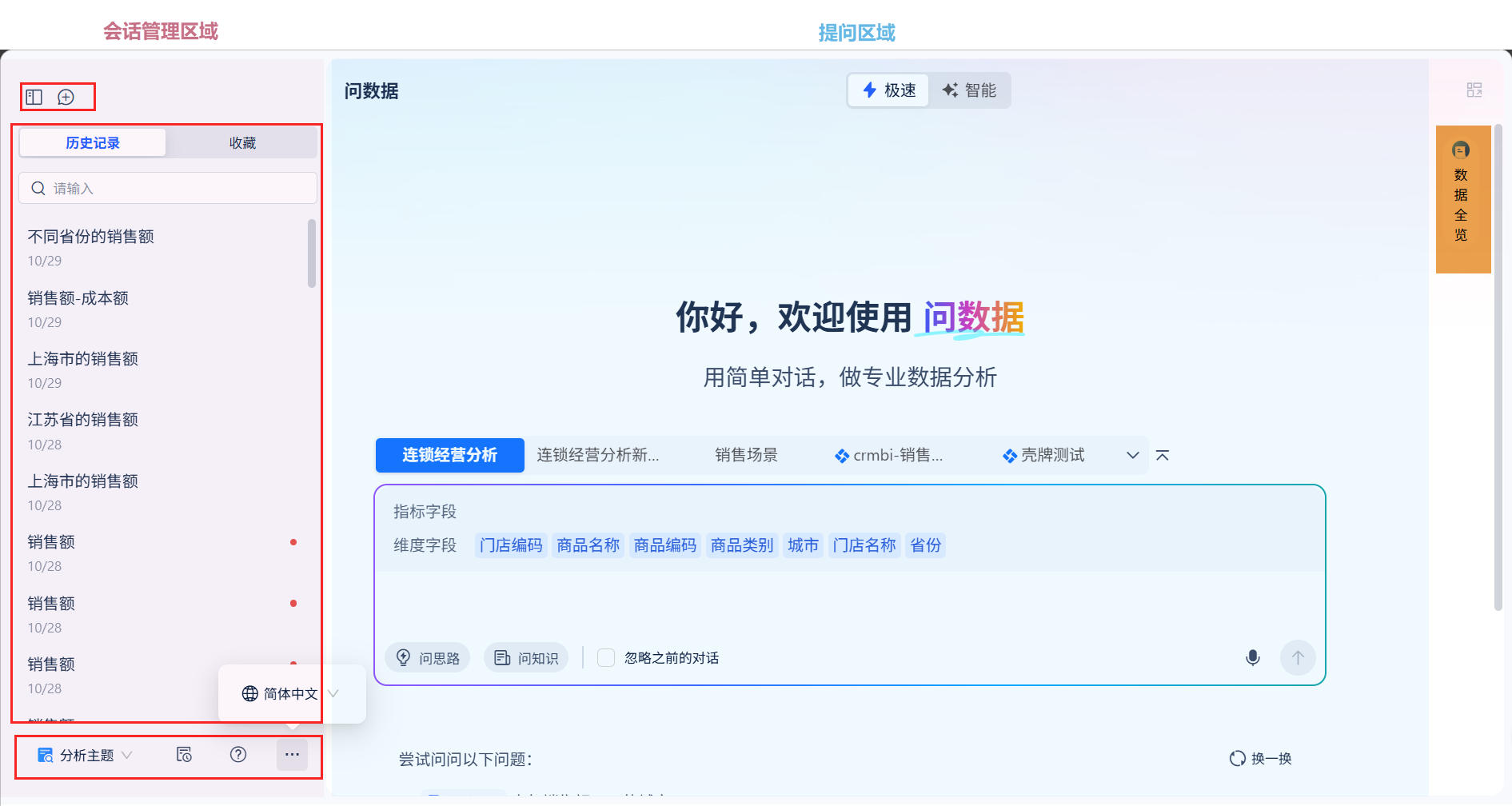 | 底部 | 分析主题/指标维度 | 切换提问模式,用户可以选择分析主题或指标维度进行提问 |