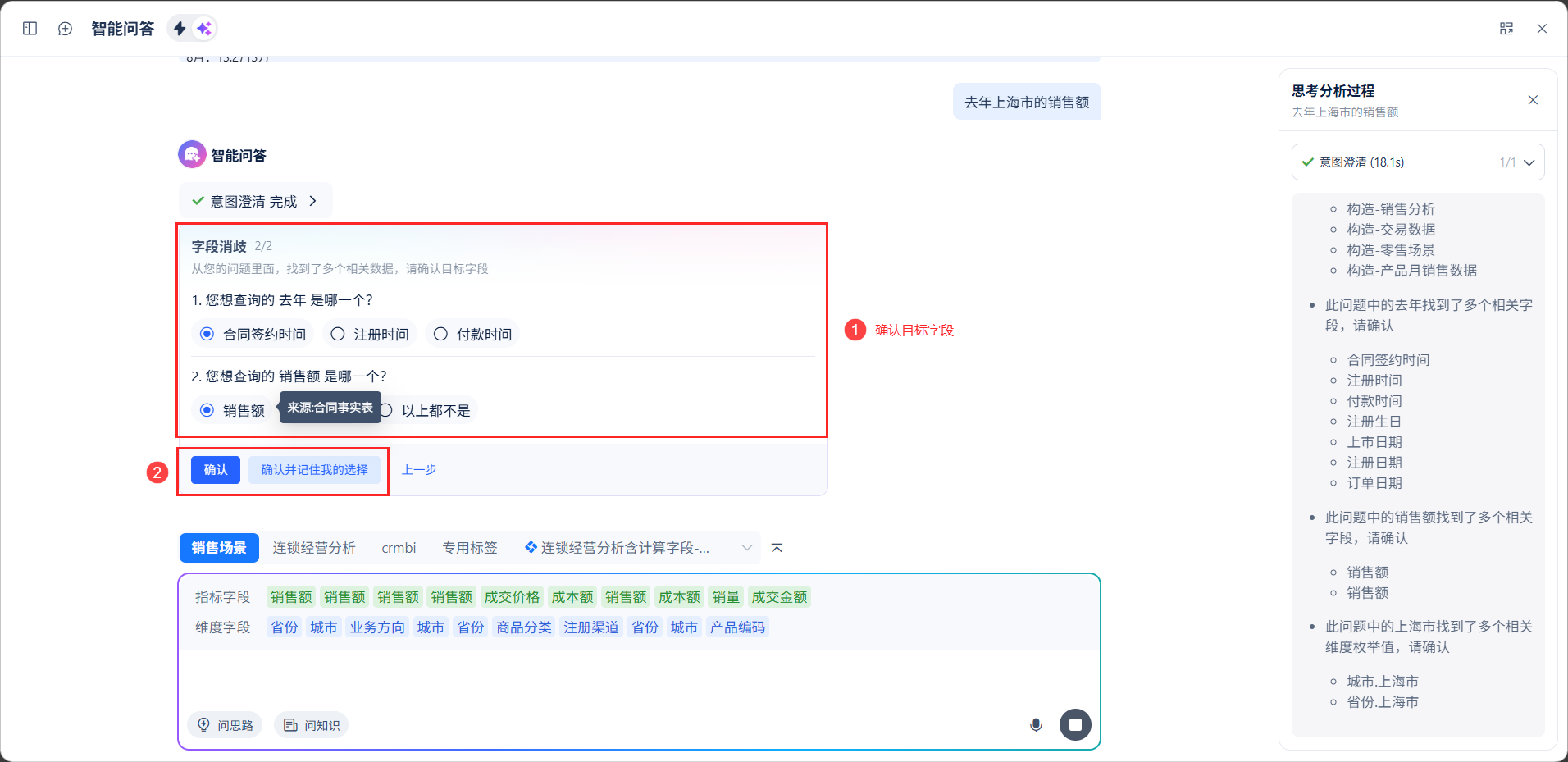 2)确认字段:若问题中存在不确定的字段,FineChatBI 会弹出主题中的字段给用户确认。