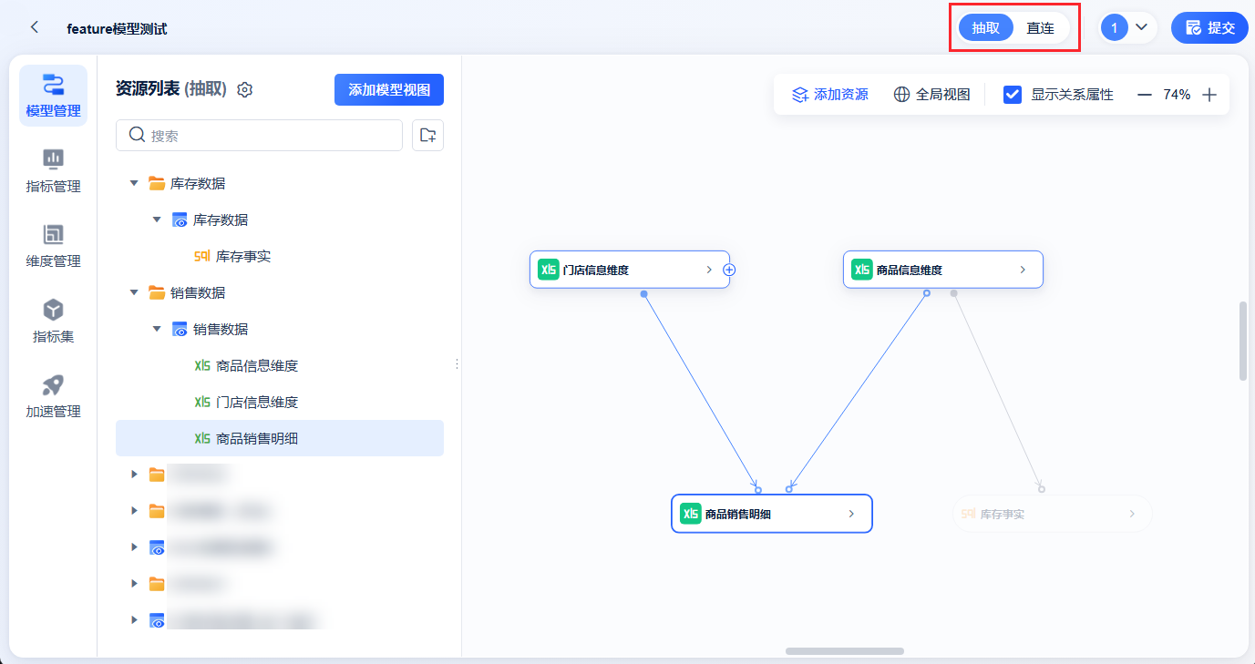 进入「数据模型」编辑页面后,选择要编辑的数据模式。可选「抽取数据/直连数据」。如下图所示: