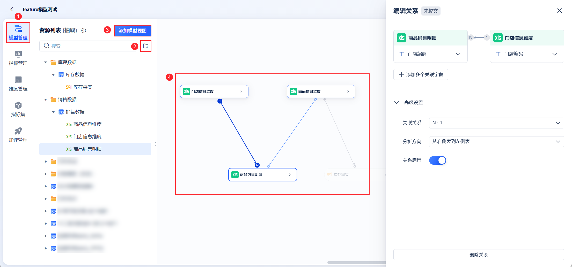 1)在数据模型中,在「模型管理」中添加文件夹后,点击「添加模型视图」创建模型视图,在模型视图内添加资源并设计表间关系。如下图所示: