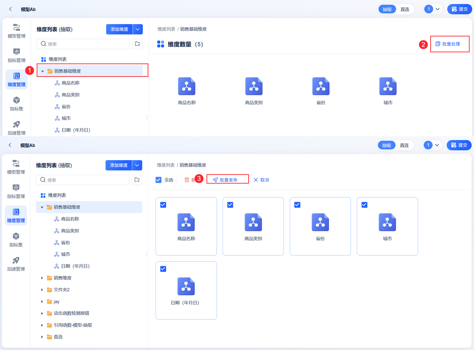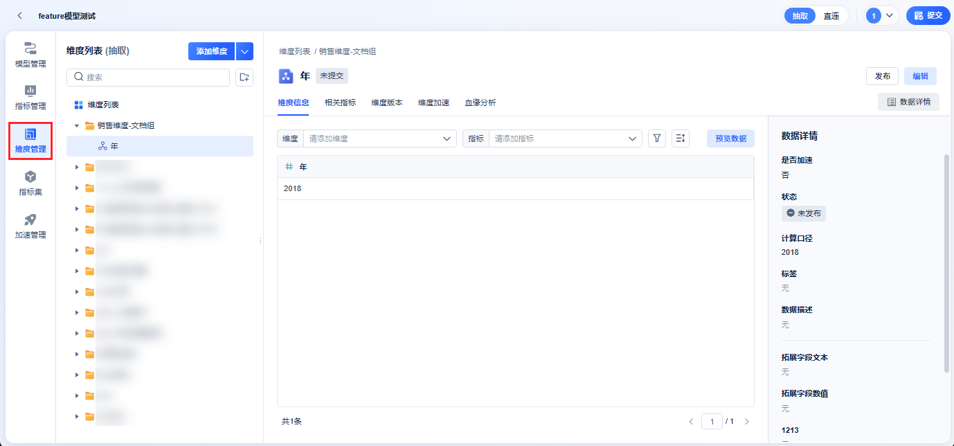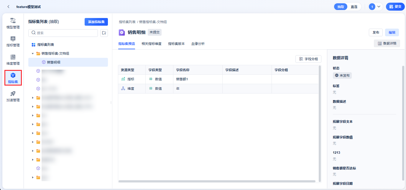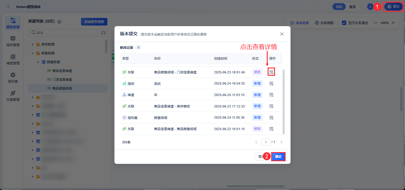 完成后,提交模型管理、指标管理、维度管理和指标集中编辑和创建的内容。如下图所示: