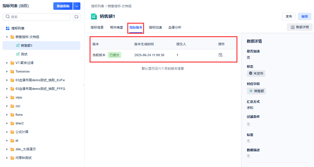 完成后,当前用户的创建和修改操作会同步到「指标中心」中。在数据预览区域,可查看版本详情以及对应的提交人。如下图所示: