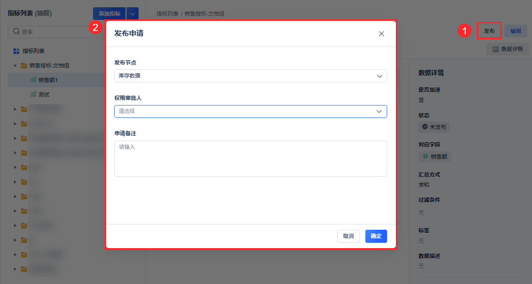 使用建议:为了更好的整合数据资源,建议为满足同一业务需求制作的指标和维度添加到「指标集」中一起发布。