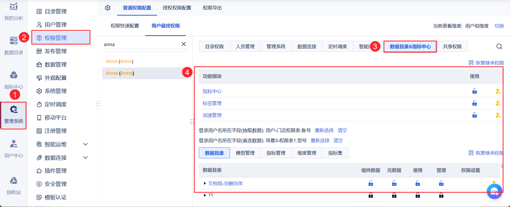 管理员先给用户分配权限「指标中心」权限,以及对应的数据权限。