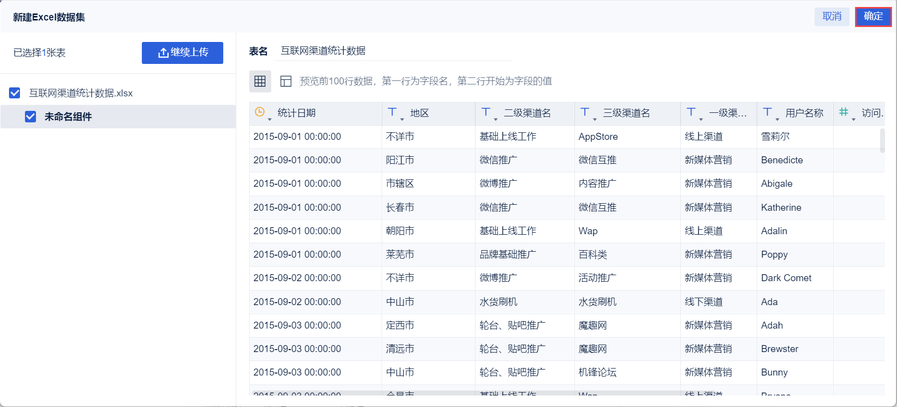 2)点击「本地Excel文件>上传数据」,上传表数据。如下图所示: