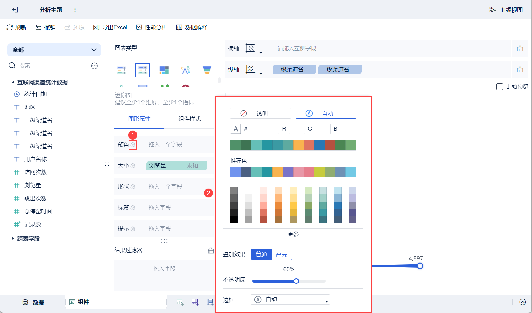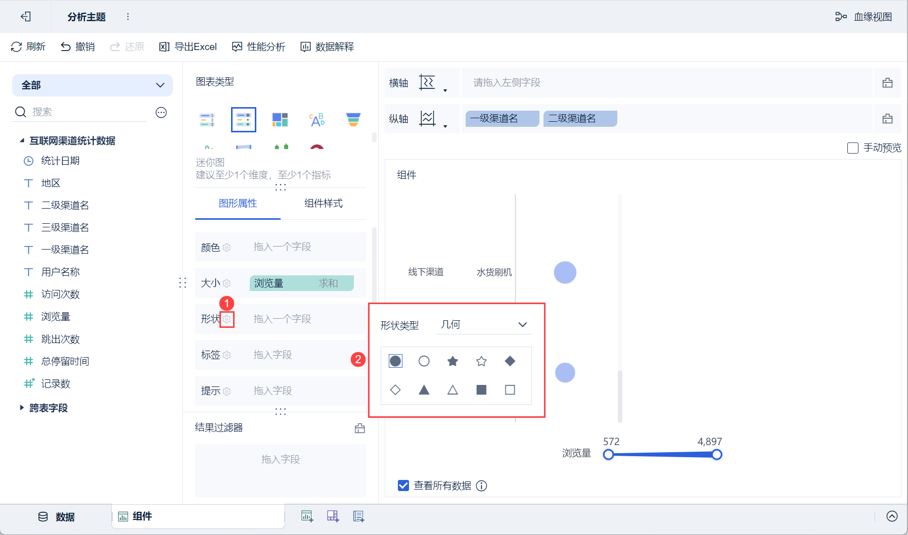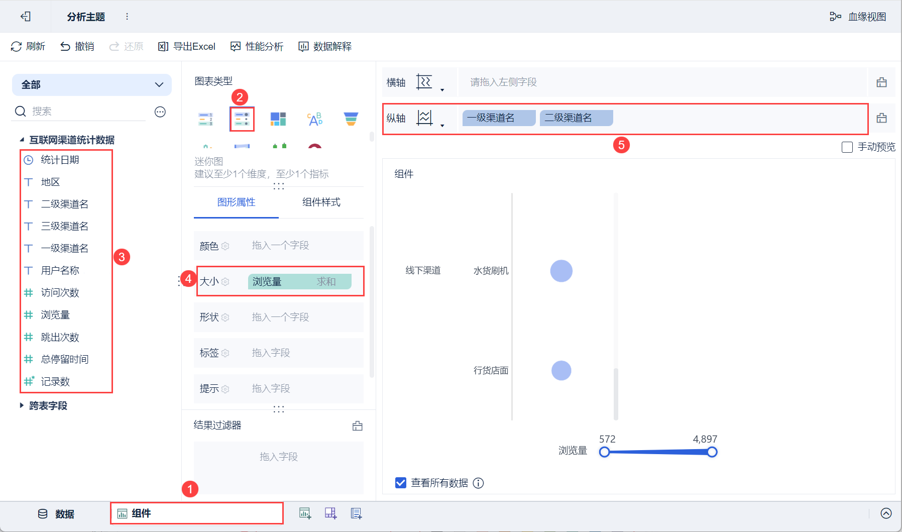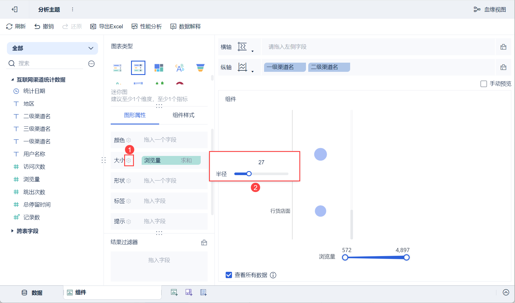 3)将左侧待分析区域的「浏览量」字段拖入「图形属性」下的大小栏中,「一级渠道名」、「二级渠道名」字段拖入纵轴,如下图所示: