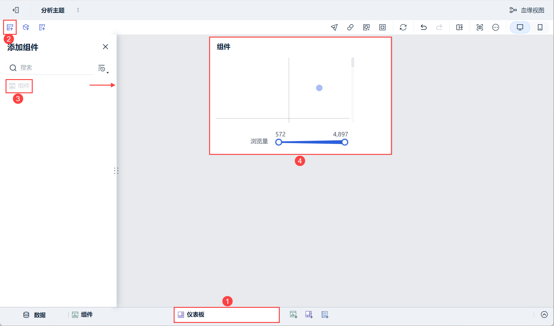 2)进入仪表板编辑界面,将组件拖入至仪表板中,如下图所示: