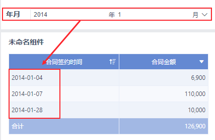 | 年月 | 选择2014年1月 | 展示「合同签约时间」为2014年1月到的数据