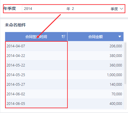 | 年季度 | 选择2014年第二季度 | 展示「合同签约时间」2014-04到2014-06的数据