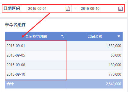 | 日期区间 | 选择2015-09-01至2015-09-10 | 展示「合同签约时间」在2015-09-01至2015-09-10的数据