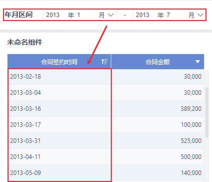| 年月区间 | 选择2013-01至2013-07 | 展示「合同签约时间」在2013-01至2013-07的所有数据