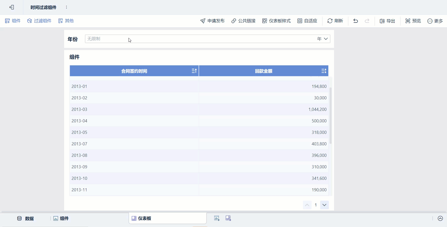 2)添加仪表板,将制作好组件拖入仪表板中,添加「年份过滤组件」,如下图所示: