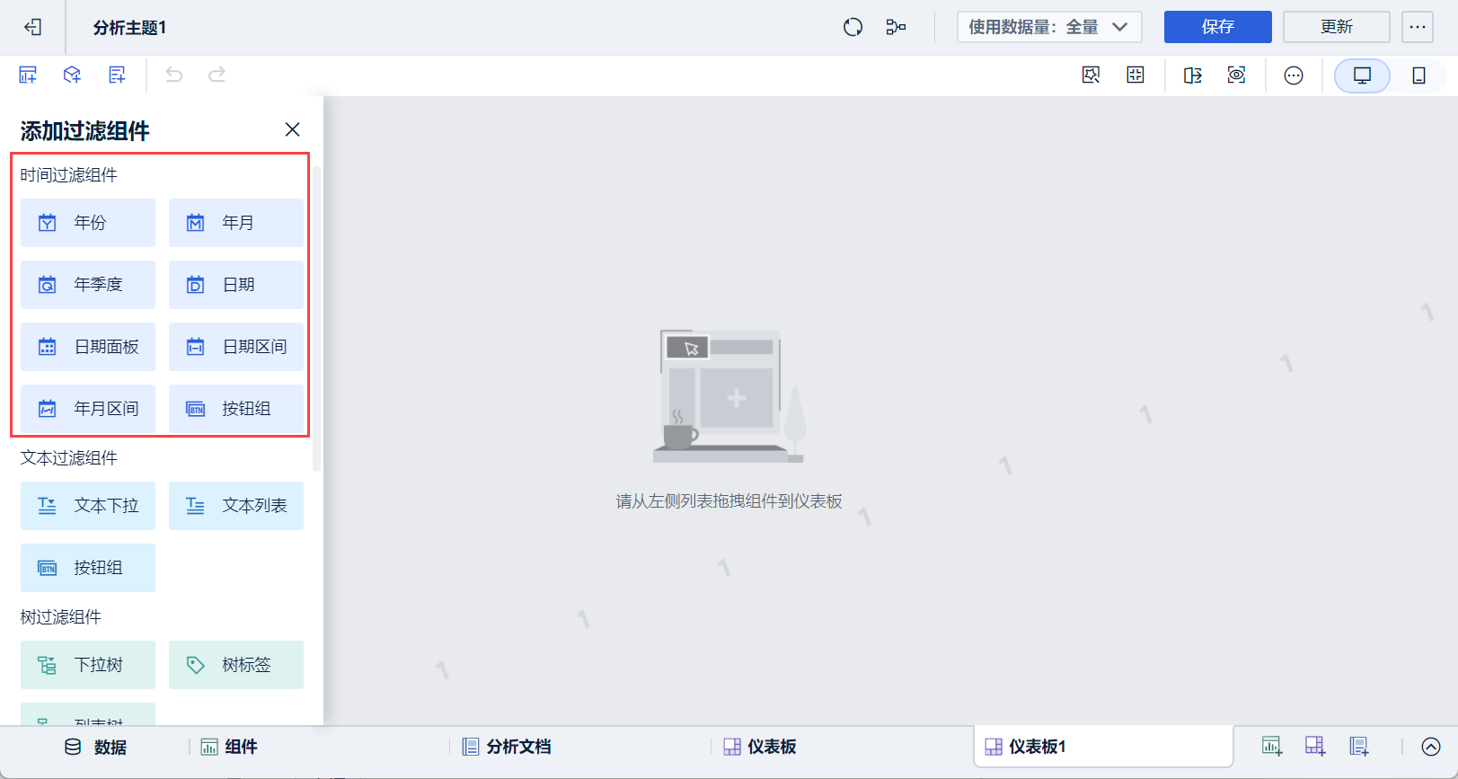 1)往仪表板中拖入「按钮组」,如下图所示: