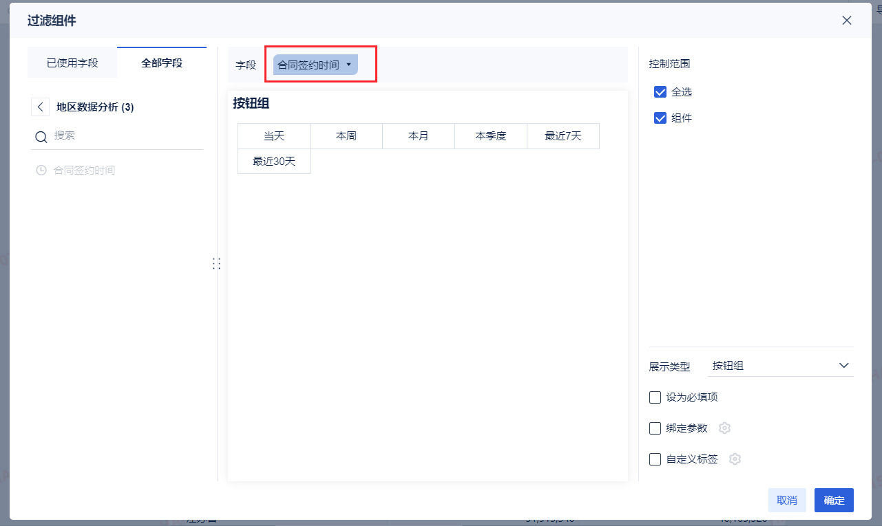 拖入时间过滤组件并绑定「合同事实表」的「合同签约时间」字段