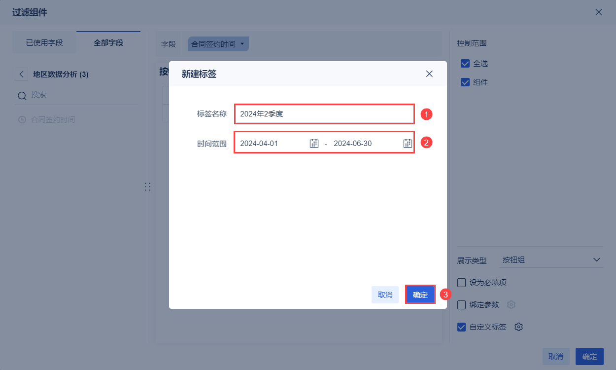 3)新建2024年1季度、2024年2季度的标签,设置标签名和标签的时间范围。如下图所示: