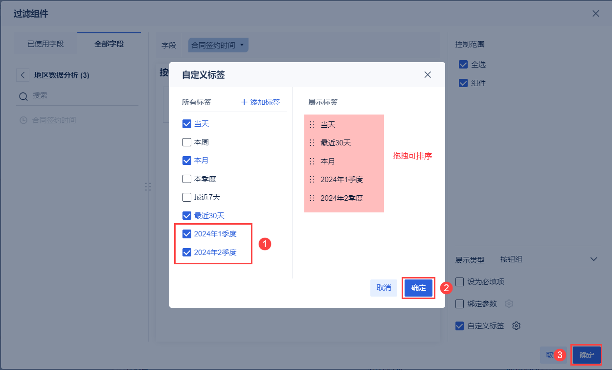 1)重新进入过滤组件编辑界面,可以对标签进行手动配置。勾选「自定义标签」,并点击「设置」,如下图所示: