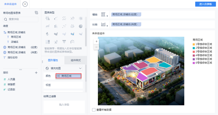 图形属性>颜色区域点击字段「商场区域」选择配色方案。将「商场区域」字段拖入标签,将「销售额」指标字段拖入提示。完成后点击进入仪表板。如下图所示:
