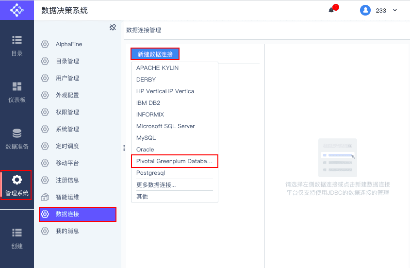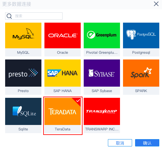 登录FineBI数据决策系统,选择管理系统>数据连接,点击“新建数据连接”并选择TeraData,如下图: