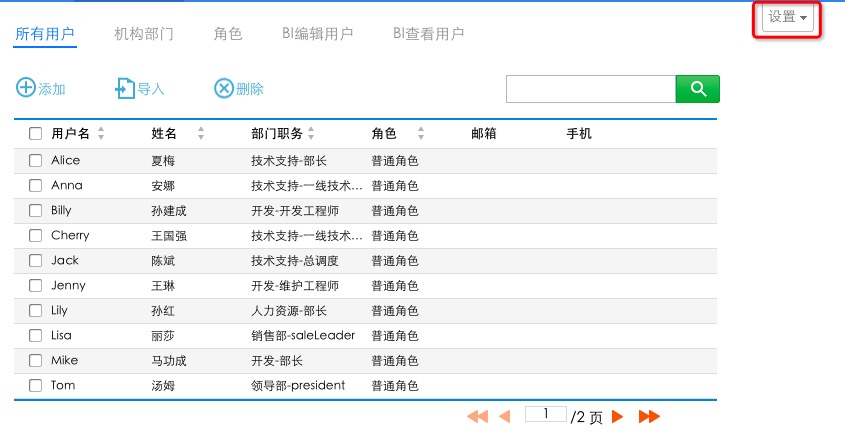 注:角色列表中不仅仅显示了机构部门,同时还显示了同一部门下的不同职位和所有角色,比如说,所有部门负责人,即所有职位为负责人的角色。